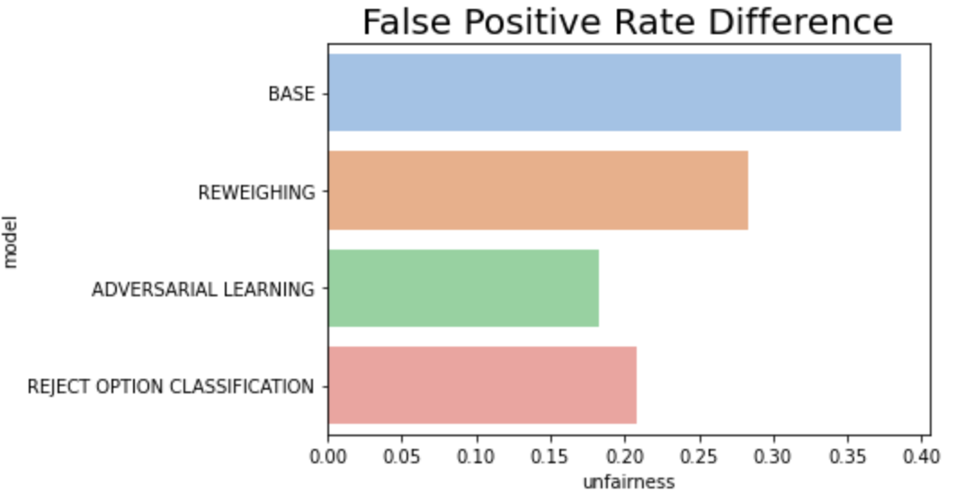 단순 양성 비율만 보는 지표를 제외한 나머지 지표들에서는 우리의 베이스라인 모델이 고등학교를 나온 사람에게 유리한 결정을 내리고 있다는 사실을 알 수 있습니다. 특히 COMPAS 케이스처럼 FPR의 차이가 38%대로 눈에 띕니다.