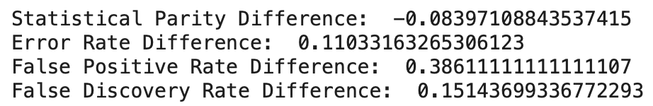 metrics의 모든 수치는 일정하게 (비졸업자 수치 - 졸업자 수치)라 다른 건(Error, FPR, FDR) 다 높을수록 불공정한 거지만 statistical parity만 반대라서 헷갈리지 않도록 부호를 바꿔, 다른 메트릭과 동일하게 클수록 불공정하도록 했습니다.