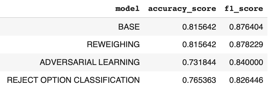 이전에 확인했던 4개의 공정성 지표가 얼마나 달라졌는지도 궁금하지만, 일반적으로 편향을 제거하기 위한 조치를 취하면 모델 성능은 떨어질 것 같은데 과연 그럴지도 궁금합니다.