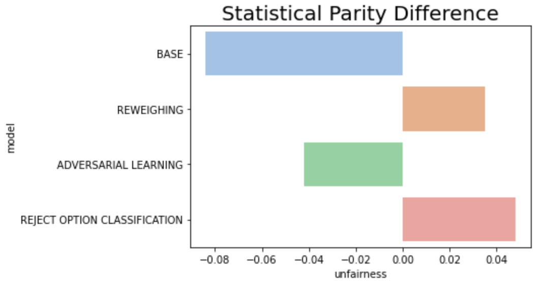 - Statistical Parity의 경우는 각 모델 별로 불공정의 방향성이 다른데, 모두 5% 미만대로 큰 수치는 아니라 의미가 없어 보인다.
