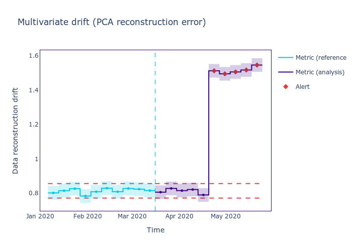 모델 성능 예측과 모니터링에 쓰이는 NannyML 패키지 공식 문서에 PCA를 사용한 방법으로 다변량 drift를 발견한 예시가 있어서 가져와봤습니다.