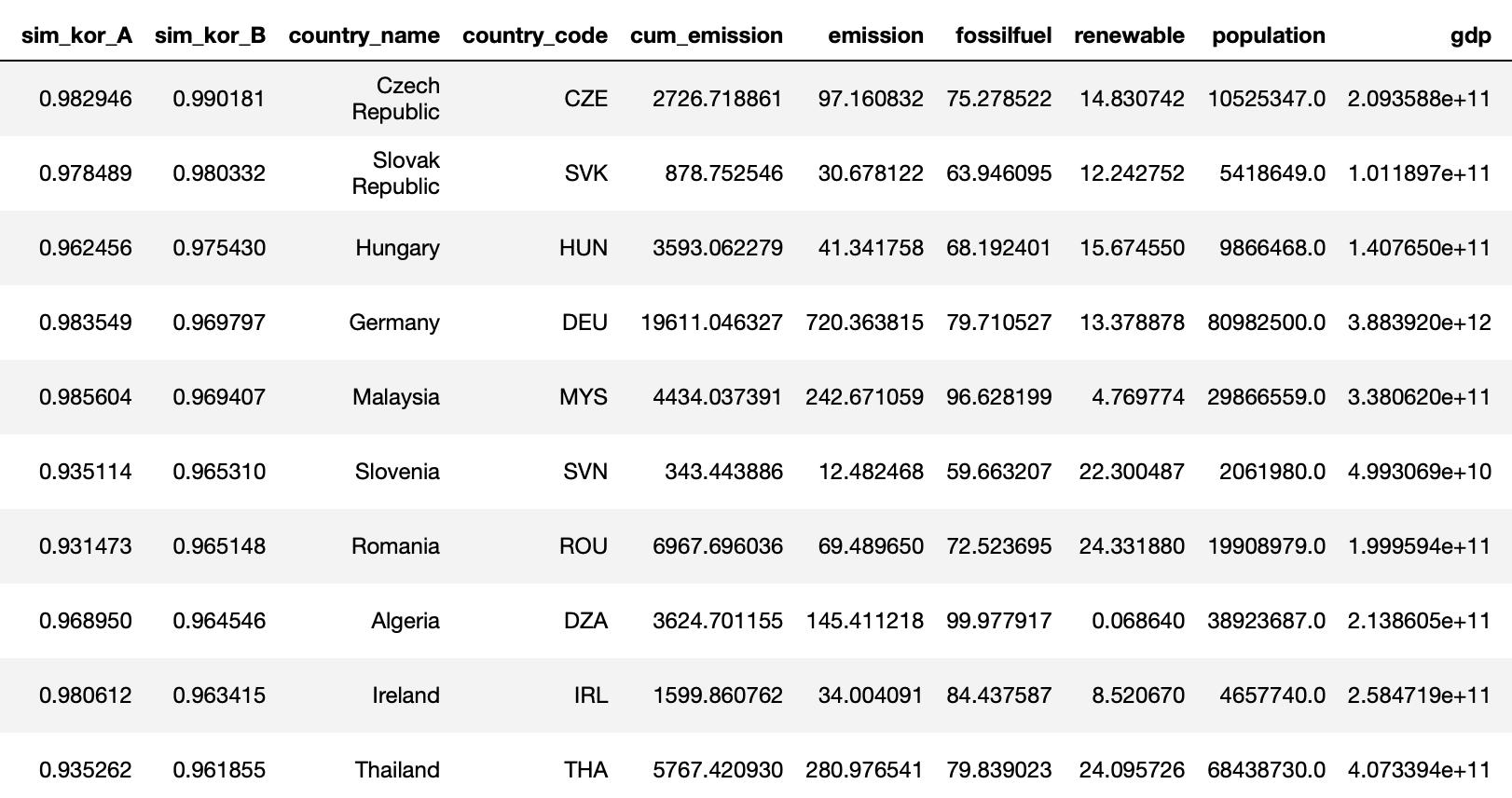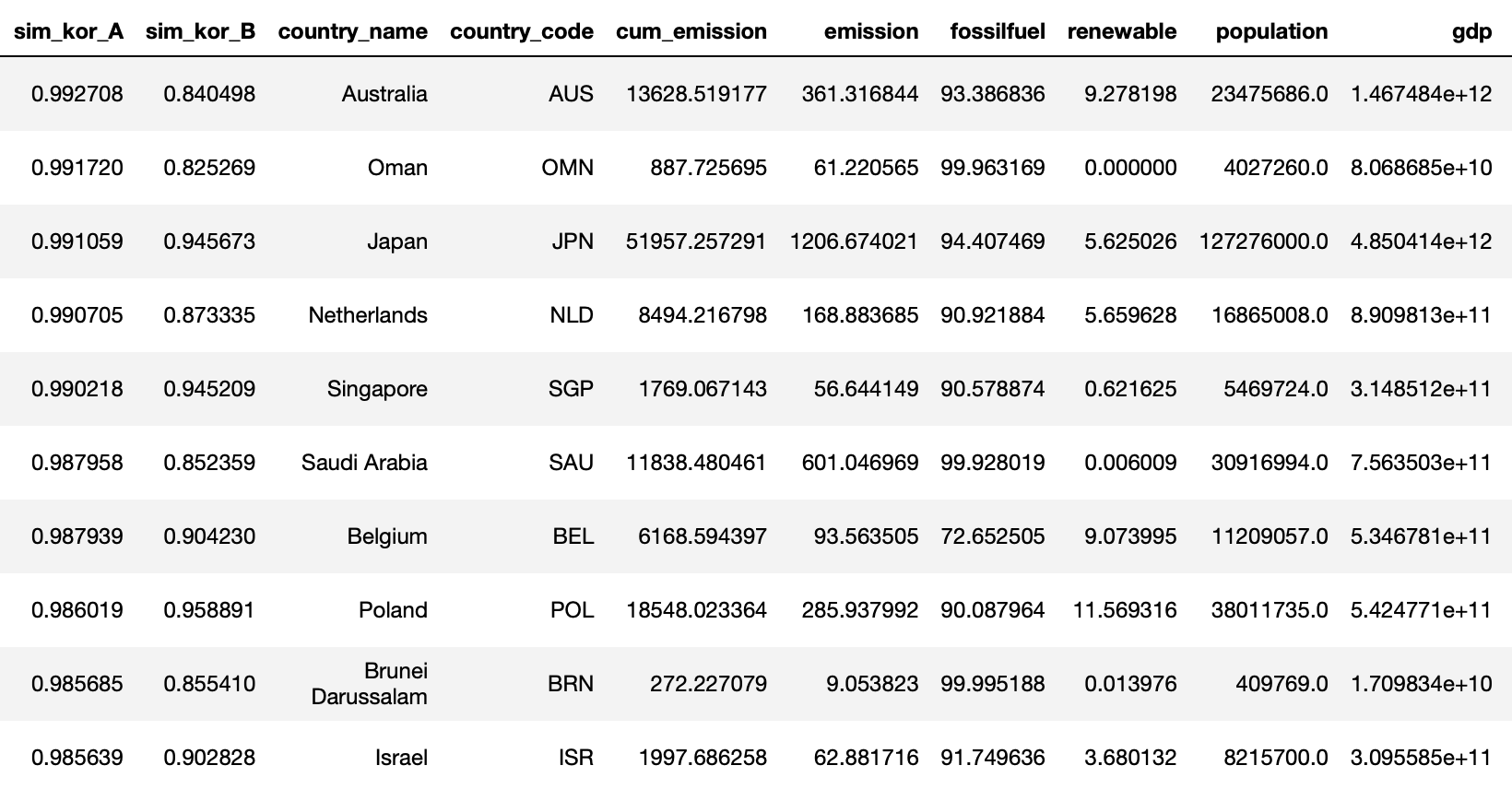 이상하게 비슷한 나라들의 경우 제 상식이 부족한 것이거나(사실 부족하긴 합니다. 학교 다닐 때 세계지리 공부를 안 했거든요), 의외로 진짜 배출량이나 GDP 비중이 비슷할 수도 있고요. 무엇보다 12가지라는 제한적인 수의 변수를 썼기 때문일 가능성이 큽니다.