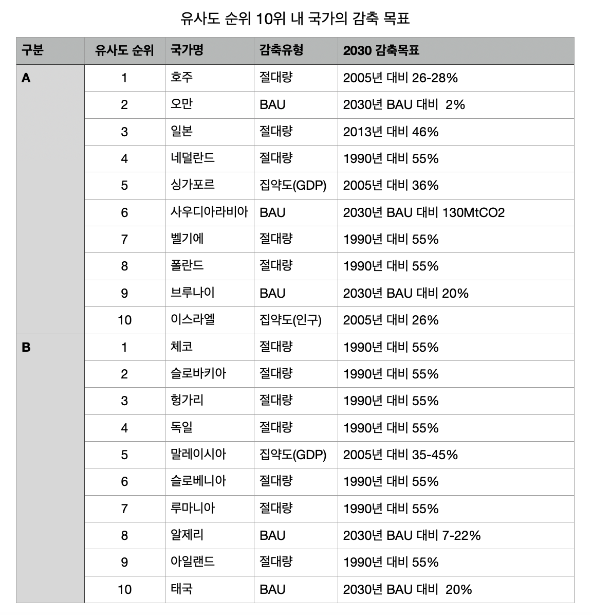 20개 나라들 중 절반이 넘는 11개국이 EU 국가들이어서(전체 데이터를 사용한 B 버전의 경우 동유럽 국가들이 다수 포함되었네요.) EU 공통 목표인 1990년 배출량 대비 55% 감축이라는 절대량 유형의 목표를 택하고 있습니다. EU는 2015년 당시 90년 대비 40%로 제출하였다가 최근 55%로 상향한 바 있습니다. 일본도 마찬가지로 초기 제출한 13년 대비 26%에서 46%로 최근 대폭 상향 계획을 밝혔고요.