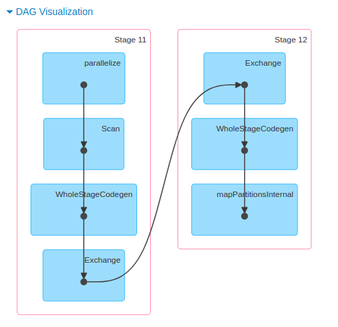 위와 같은 타임라인부터, 각 스테이지가 실행될 때 스파크가 수행하는 DAG를 시각화해 볼 수도 있고요.