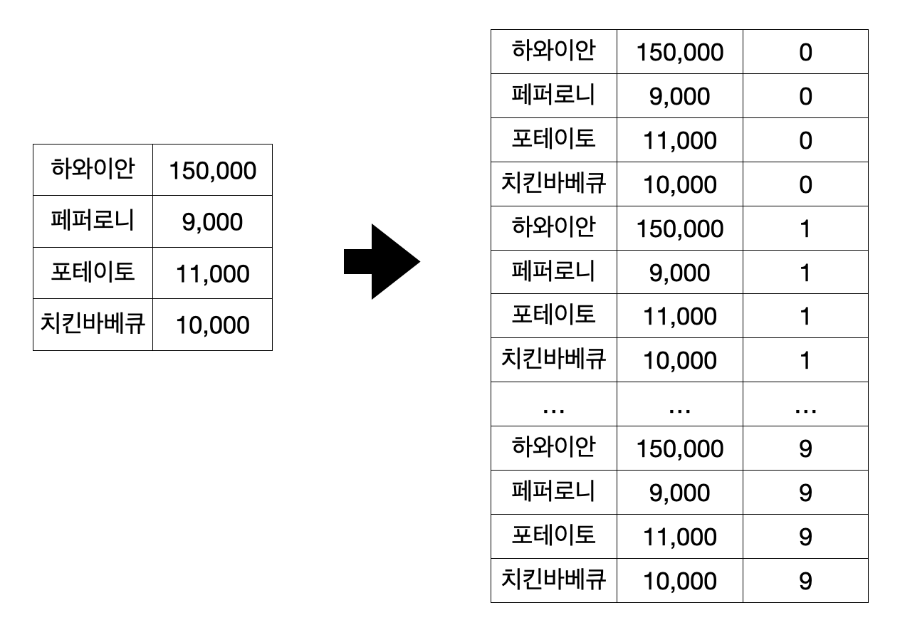 그러면 작은 테이블 B에는 무슨 짓을 해야 할까요? B는 dimension table처럼 매우 크기가 작은, 예컨대 가격표라고 해봅시다. 여기다도 저 숫자 키를 넣어줘야 하는데요, 이때는 숫자 키의 크기, N=9였다면 10만큼 B를 뻥튀기를 해줍니다. 이제 B에도 저 Salted key 변수가 만들어졌죠.