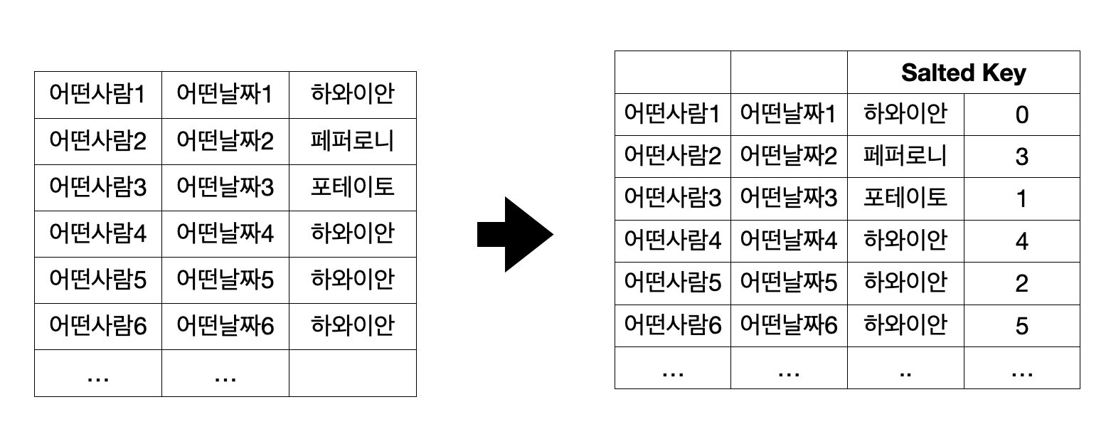 뭔가 편법 같으면서도 오 이런 팁이? 싶기도 한, 개인적으로 굉장히 재미있게 느꼈던 방법입니다. Salting은 간단히 말하면 랜덤한 값을 가지는 칼럼을 추가한 뒤 이걸 이용해서 파티션이 잘 나눠지도록 하는 건데요. 무슨 말인지 잘 이해가 안 갈 것 같으니 예시를 들어 보겠습니다.