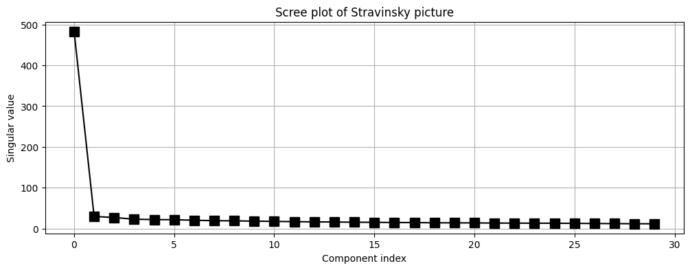 우리가 압축하려는 행렬은 640 $\times$ 430 짜리입니다. SVD를 해보고, 그 다음 얻은 특이값들을 scree plot으로 시각화해 봅시다.