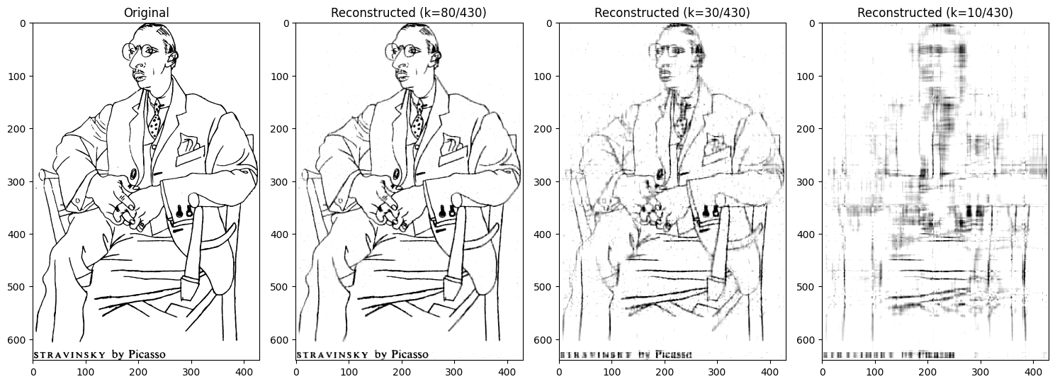 이제 여러 개의 $k$ 값을 골라서 이미지를 압축해봅시다. $k$를 고르고, 그에 맞춰서 $U$, $S$, $V$를 자르고, 다시 곱해주면 됩니다.