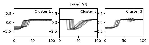 시각화해 보면, k-means의 결과랑 살짝 다르게 나왔죠. DBSCAN은 정해진 eps보다 거리가 멀면 noise로 분류해버립니다. K-means의 2번 군집을 2개의 군집(1, 3번 군집)으로 나눠버렸고, K-means의 1번 군집을(3번 군집이랑 비슷한데 위로 삐죽 솟은 패턴이 있는 애들)은 노이즈로 취급돼서 날아갔어요. 다시 말하지만 DBA k-means 샘플 데이터라서 거기서 최적의 결과가 나오는 건 어쩔 수 없을 것 같아요.