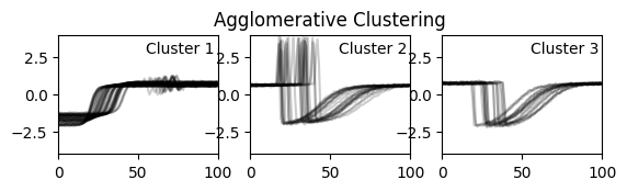 에서 제공하는 클러스터링을 위해 쓸 수 있는 샘플 데이터입니다. 시계열 개수(n)는 100개고 각 시계열의 길이(m)도 100으로 맞춰줬고, 라벨은 3개만 가져왔습니다.