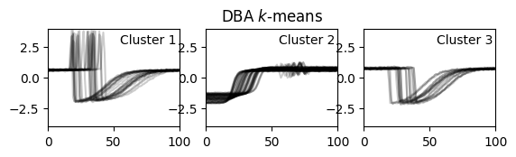 그래서 DTW 개념을 유지하면서 여러 시계열의 평균을 내는 방법인 DBA(Dynamic Time Warping Barycenter Averaging) 라는 친구가 등장했습니다(논문). DTW를 사용한 k-means는 3번 단계에서 이 방법을 사용합니다.